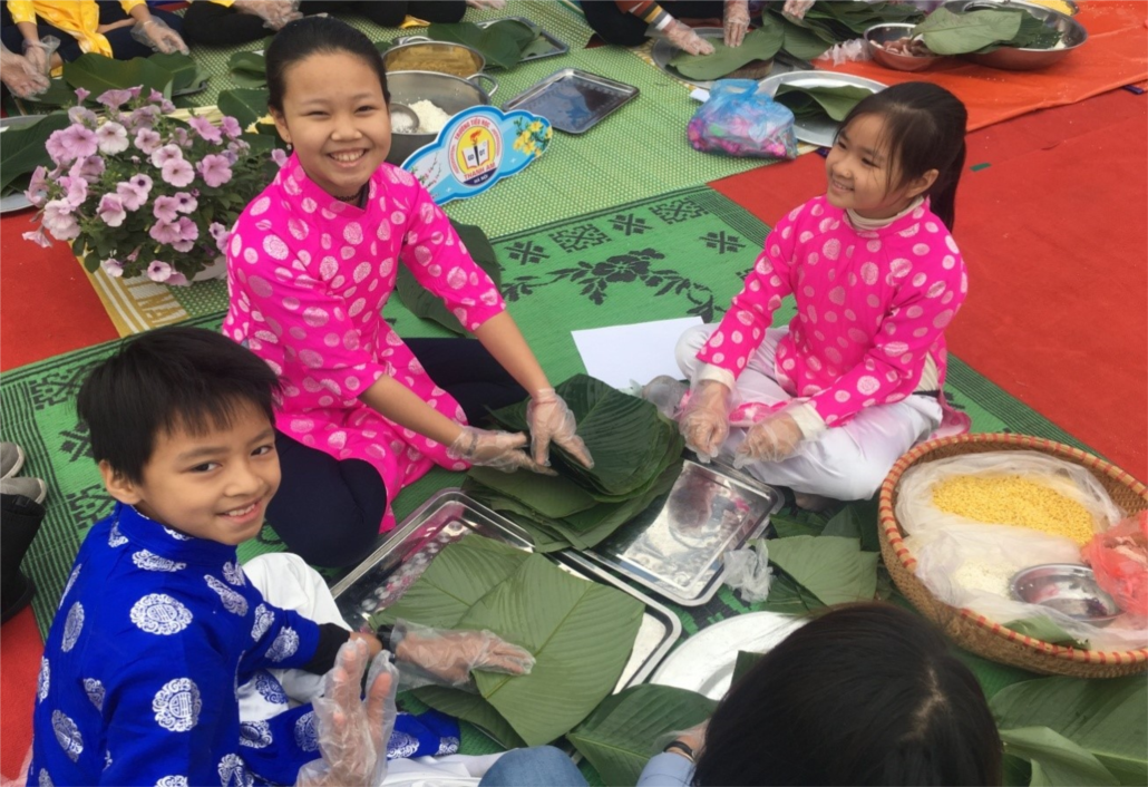 Hội thi gói bánh chưng "Phong vị ngày xuân" của học sinh Tiểu học. Mỗi đội thi gồm 03 học sinh sẽ gói 10 chiếc bánh chưng và được trưng bày đẹp.