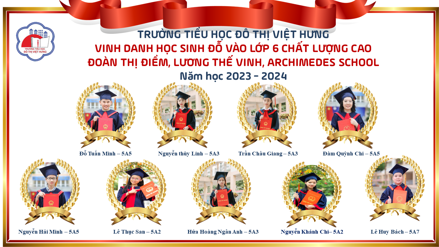 Không chỉ vậy, học sinh trường tiểu học Đô Thị Việt Hưng luôn tích cực trong học tập và rèn luyện. Trong những năm qua, học sinh khối 5 của nhà trường luôn được xếp vào Top đầu các trường có nhiều học sinh thi đỗ vào THCS chất lượng cao trên địa bàn thành phố Hà Nội. Năm học 2022 – 2023, khối 5 của nhà trường có thành tích thật đáng tự hào với 61 học sinh đỗ vào trường Chất lượng cao trên địa bàn thành phố Hà Nội như Lương Thế Vinh, Đoàn Thị Điểm, Archimedes School, Chu văn An, Nguyễn Gia Thiều… Đặc biệt trên địa bàn quận Long Biên, hai trường chất lượng cao là trường THCS Chu văn An và THCS Nguyễn Gia Thiều đã ghi danh rất nhiều học sinh của trường tiểu học Đô Thị Việt Hưng.